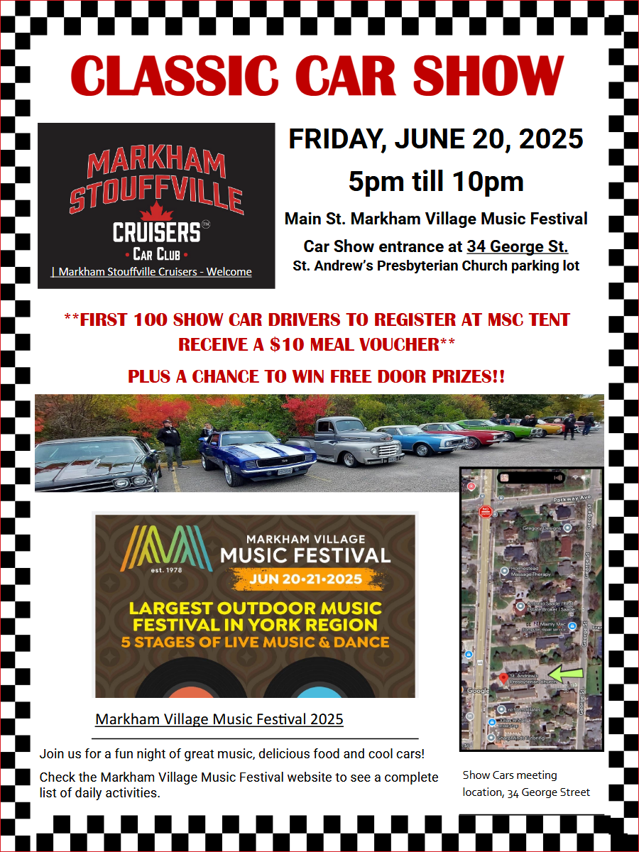Markham Main St. Music Festival car show — June 19, 2026. More to come soon so return later for more detils!